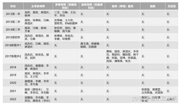 华语乐坛重量级导师一向是好声音标配,节目组每年不惜重金请来至少四位。十一年间,导师来去更迭换了不少,但导师的种类、作用、与学员的关系却发生着持续变化。笔者首先把这十一年来的全部导师(含助教)做了盘点: