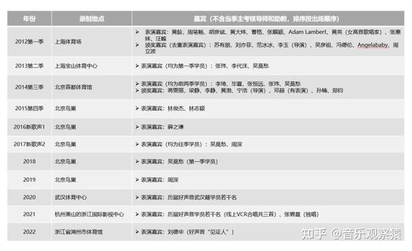 · 本文从总决赛嘉宾阵容、节目时长、录制地点、录制形式、比赛投票机制和总决赛后动作共六个方面的具体事例出发,带大家回顾了好声音十一年间关于总决赛的巨大变化。从万人空巷到无人问津,一兴一衰间也是整个华语乐坛命运的一个缩影。