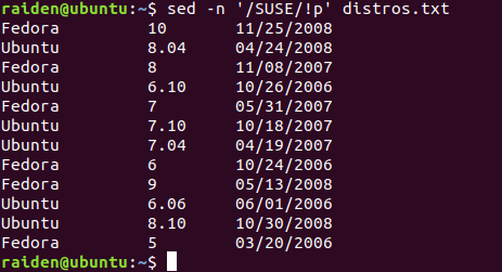 [me@linuxbox ~]$ sed -n '/SUSE/!p' distros.txt