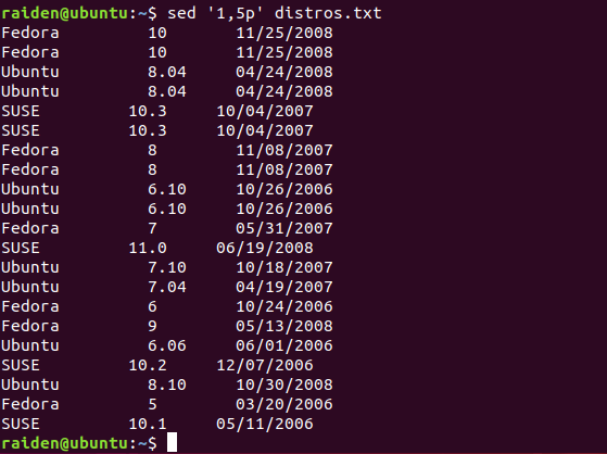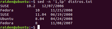 [me@linuxbox ~]$ sed -n '1,5p' distros.txt