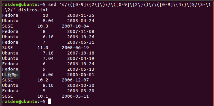 到目前为止,这个 s 命令是最常使用的编辑命令。我们将仅仅演示一些它的功能,通过编辑我们的 distros.txt 文件。我们以前讨论过 distros.txt 文件中的日期字段不是“友好地计算机”模式。 文件中的日期格式是 MM/DD/YYYY,但如果格式是 YYYY-MM-DD 会更好一些(利于排序)。手动修改 日期格式不仅浪费时间而且易出错,但是有了 sed,只需一步就能完成修改: