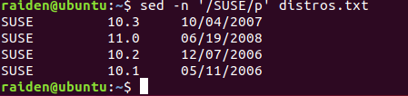 [me@linuxbox ~]$ sed -n '/SUSE/p' distros.txt