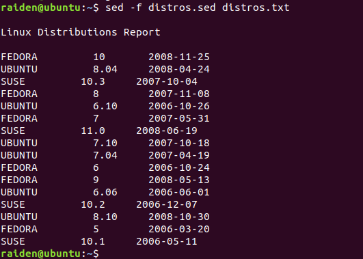 我们将把 sed 脚本保存为 distros.sed 文件,然后像这样运行它:
