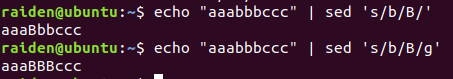 [me@linuxbox ~]$ echo "aaabbbccc" | sed 's/b/B/g'