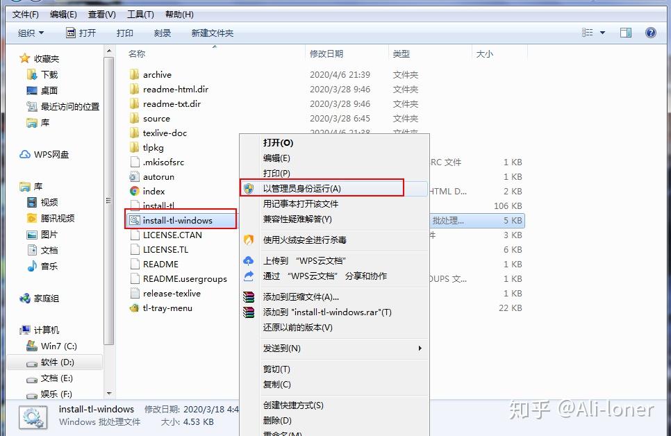 ⑤ 找到 "install-tl-windows" 文件,为了后面不必要的麻烦,右键 以管理员身份运行