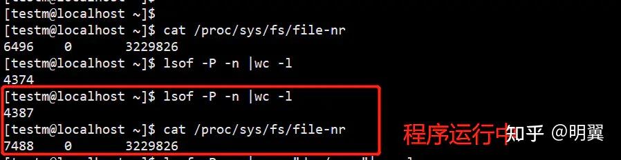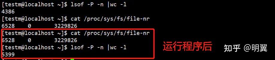 我们写了这样一段代码,编译再另外一个终端运行,运行前面,通过下面的命令查看打开的句柄数量,和文件描述符的数量;运行后发现,lsof查看的文件描述符的数量增加了一千多,而文件句柄的数量没有增加,说明了,lsof查看的是文件描述符,通过测试我们也发现了ulimit -n限制的就是文件描述符的数量。