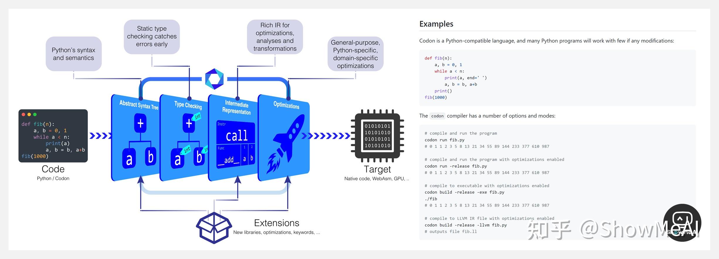 Codon 是一个高性能的 Python 编译器,可将 Python 代码编译为本机机器代码,且无需任何运行时的开销。单线程时,Codon 的性能通常与 C/C++ 相当,比 Python 快 10-100 倍甚至更多;此外,Codon 还支持本机多线程,也可以使速度提高很多倍。Codon 框架是完全模块化和可扩展的,允许无缝集成新模块、编译器优化、领域特定语言等。