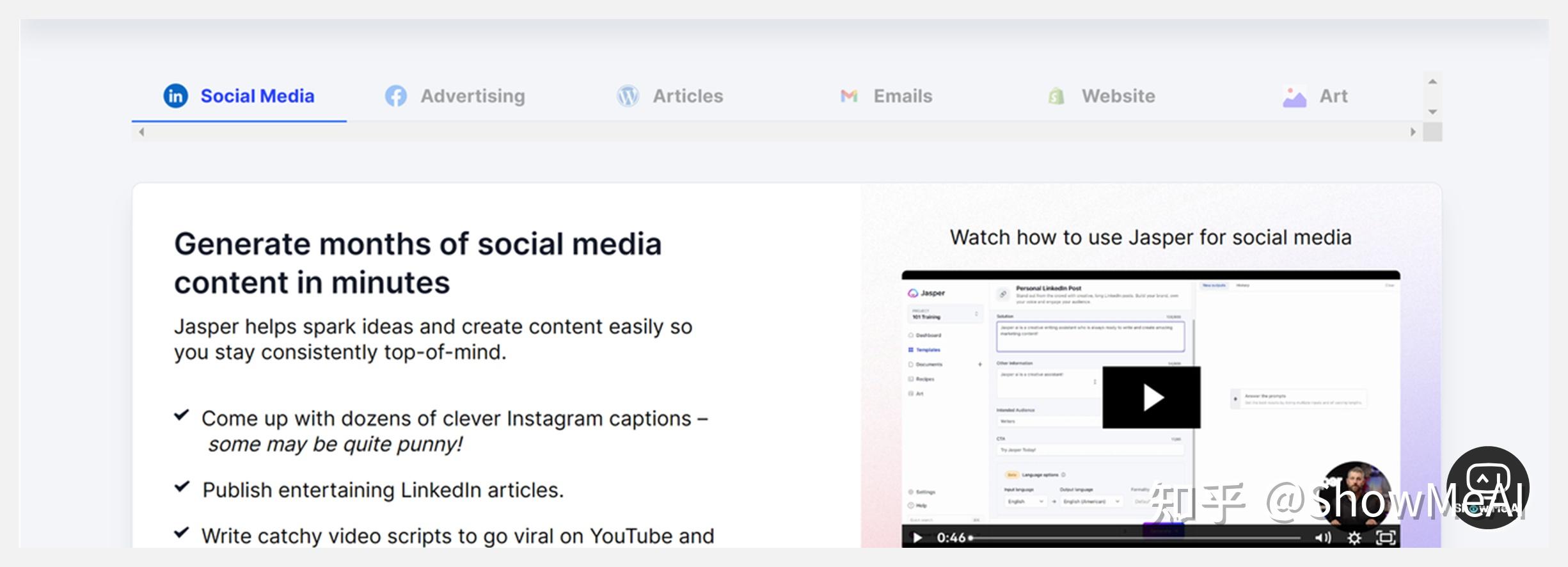 同样是基于 GPT-3 技术的写作软件,Jasper 提供了面向企业团队的 AI 写作助手,覆盖社交媒体po文、广告文案,往来邮件、网站展示、图片绘制等商业场景,大大提升团队的工作效率。在内容营销大行其道的当下,Jasper 将 AI 技术的爆发力迅速带入了内容营销的商业领域,既快速生成了可用的文案稿件,又避免了侵权风险。