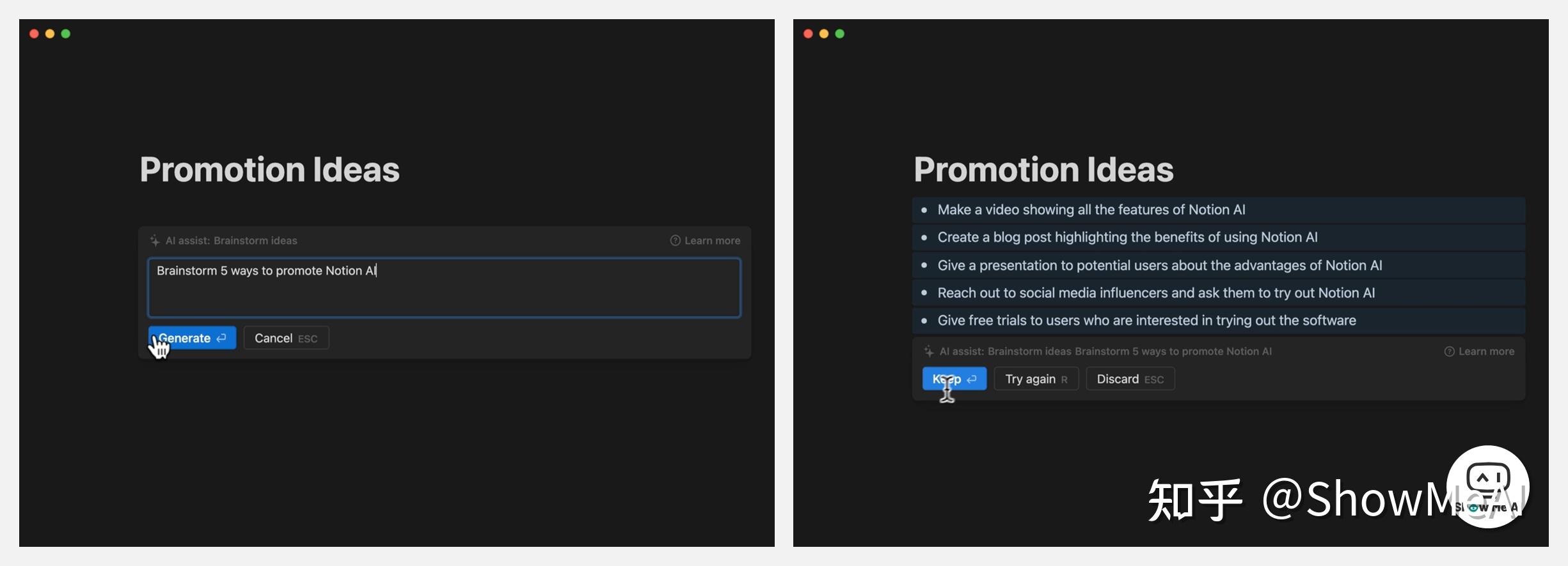 使用 Notion 创建新页面时,除了 Empty page(空白页面)外,还包括 Blog post(博客文章)、Brainstorm ideas(头脑风暴)、Pros and cons list(优缺点列表)等候选项。我们点击 Brainstorm ideas 输入文本提示后,Notion 就开始生成候选 ideas,喜欢可以选择保留,不喜欢可以更新提示后进行重试。整体使用体验很酷炫!