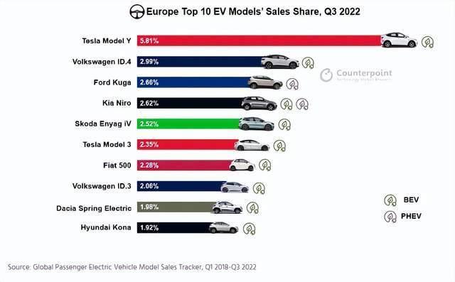 法国汽车行业咨询机构Inovev给出的数据显示,2022年前9个月,中国制造的汽车在欧洲售出了约15.5万辆,仅占欧洲电动汽车市场5.8%的份额,还无法与美国的特斯拉、欧洲本土品牌大众及宝马相提并论。