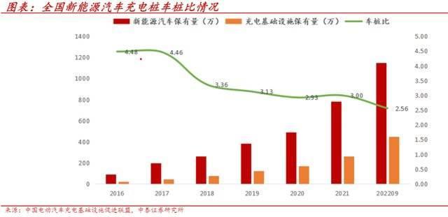 从2015年的6.36:1、2019年的3.13:1,一直降到2022年的2.5:1左右。即便是公共车桩比,中国也从9:1降到7:1附近。充电桩建设的步伐基本与新能源车的高速增长相匹配,基本满足了车主的充电需求。