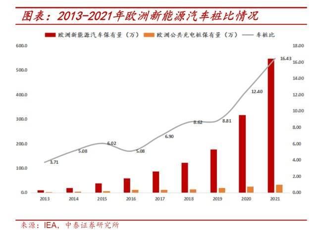 IEA的统计数据显示,2021年欧洲电动汽车保有量从2013年的10.3万辆增到2021年548.3万辆,CAGR(复合年均增长率)为55.6%;但同期欧洲公共充电桩保有量为2.8万台增长到33.4万台,CAGR仅为31.88%。