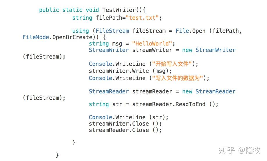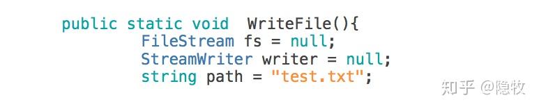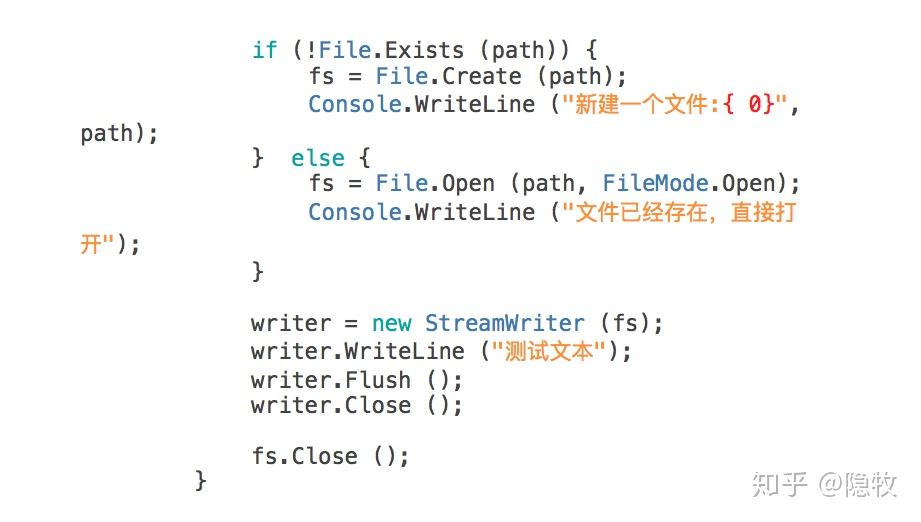 以上代码通过File.Exists方法判断指定路径下的文件是不是存在,如果文件存在,则直接调用File.Open将文件打开,否则将调用Create方法创建一个文件。然后,代码会初始化一个StreamWriter对象,然后向文本中写入字符串操作。最后,程序会通过调用Flush方法清空缓冲区,然后将所有的缓冲区数据写入文件,并且调用CLose方法关闭数据流。