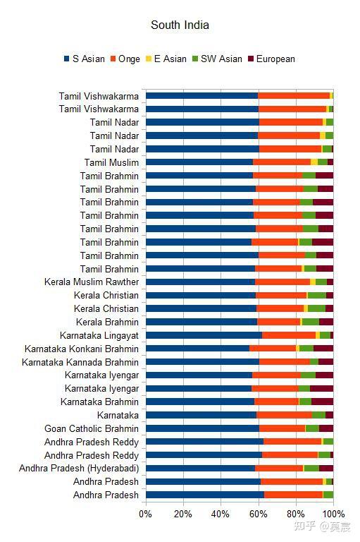 南印度的高种姓和东南亚的高种姓一样,都来自其原有的社会阶层。这是南印度各人群的常染成分。蓝色的是南亚成分,红色的是原住民成分,黄色的是东亚成分,绿色的是西亚成分,紫色的是欧洲成分。南印度的婆罗门确实相比其他人多出了一些欧洲成分,但这多出来的欧洲成分实在很有限。与其说南印度的婆罗门是从北印度来的,倒不如说相比其他阶层,南印度婆罗门与北印度有更多基因交流。
