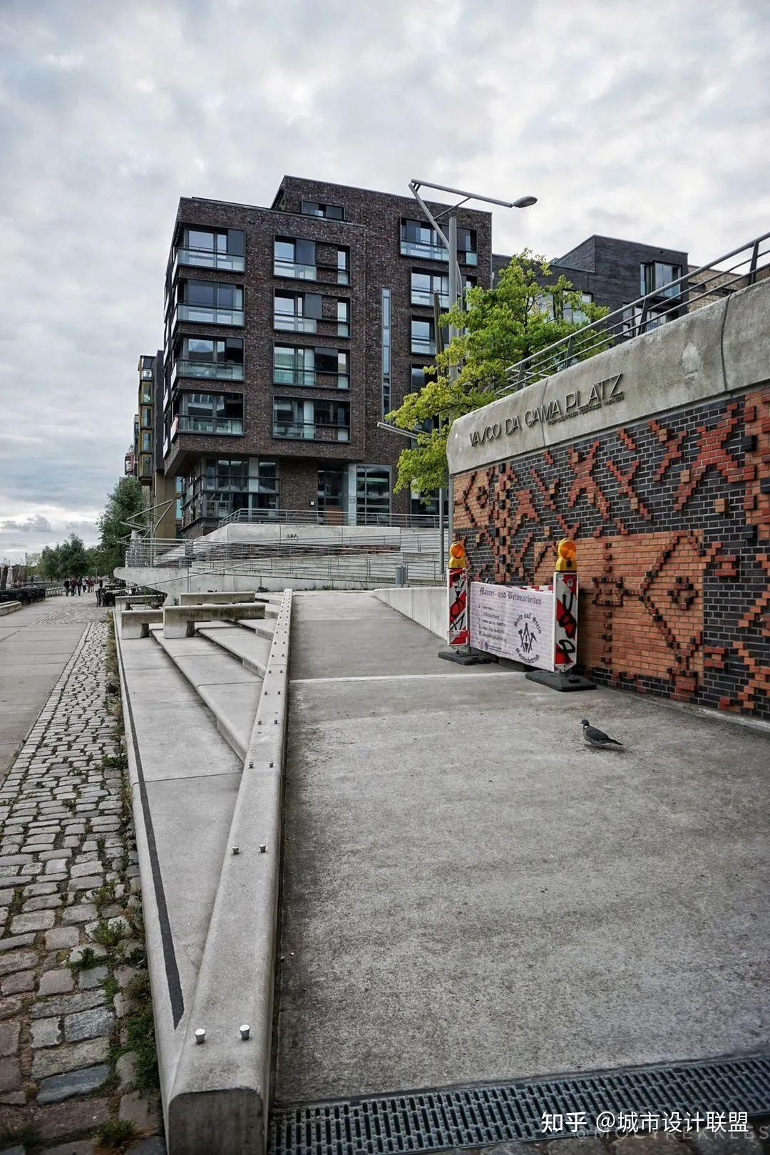△ 临近仓储区的开放空间 (©Photo by Mocy) 城市韧性方面,由于港口新城地处易北河潮汐区,面临着一定的洪水威胁,因此新项目均建设于高于原先港口水平面8-9米的防洪高地上,而不是按照惯常的做法通过修建堤坝或通过防洪设施进行保护。 人为加高的防洪安全高地在地面与水域之间留下了灵活的边界:滨水平台、广场等地势较低的区域被用作泄洪区,在发生严重洪水时会被淹没,虽然这时的港口新城会短暂地失去部分公共区域,但它仍然能维持城市整体正常功能的运转。
