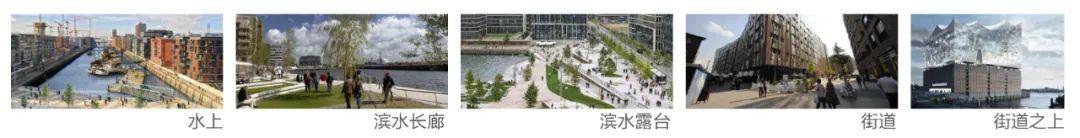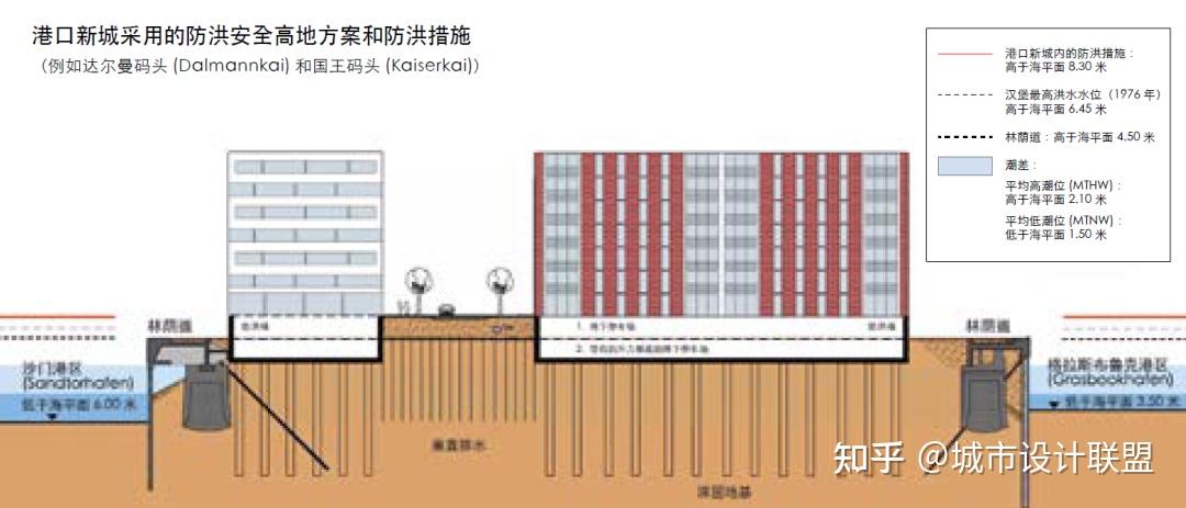 ▨ 公共空间的五种层次 HafenCity位于汉堡主堤防南部,易遭受洪水侵袭。由于修建新的堤防不利于新城公共空间的整体营造,因此开发商选择基于海拔8.5米的人工基地开发高楼,从而连接HafenCity与现有市区。 这一高度是根据汉堡市防洪标准确定的,即使最极端情况下的暴雨洪水也无法侵袭该地区。