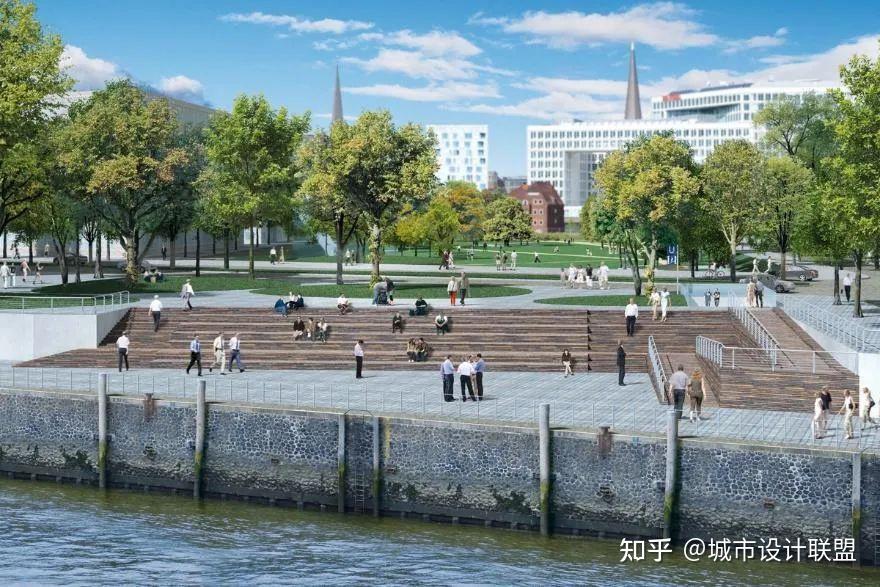 HafenCity的高差使这里形成了五种层次的公共空间: ✔水上: 从河岸边可以踏上河面的码头。 ✔滨水长廊: 供步行和骑行的堤防长廊位于海拔4至5.5米的高度。 ✔滨水露台: 麦哲伦露台和马可波罗露台作为该地区最大的公共广场,创造性地将道路从滨水长廊连接至城市街道。 ✔街道: 所有街道(和建筑物)均建在海拔7.5至8米的人工抬高的防洪基地上。 ✔街道之上: 在街道的水平面之上,还有更高的空间可对外开放,有些是公共空间,有些是私人空间。易北音乐厅在海拔37米的地方建造了一个新的公共广场。同时,所有的住宅单元均始于建筑的二层,从而进一步提升了抵御洪水的能力。