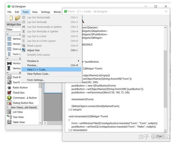您可以通过选择Form菜单下的View C++ Code选项看到下面的界面。这些是生成UI代码。您可以在创建动态UI时重用这些代码: