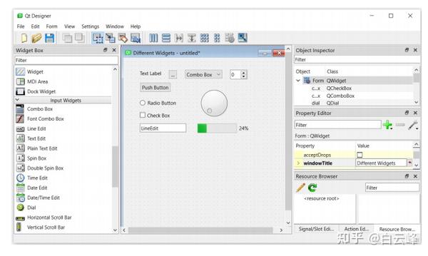 下面的屏幕截图显示了小部件框部分中可用的不同类型的小部件。我们在表单编辑器区域添加了几个现成的小部件,比如标签(Label)、按钮(Push Button)、单选按钮(Radio button)、复选框(Check Box)、组合框(Combo Box)、进度条(Progress Bar)和行编辑(Line Edit)。这些小部件是非常常用的小部件。您可以在属性编辑器(Property Editor)中浏览特定于小部件的属性:
