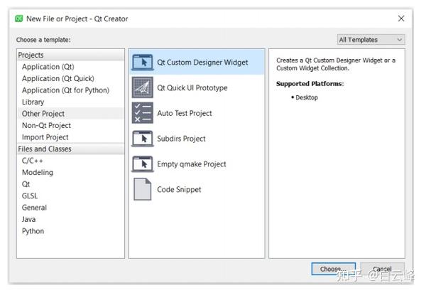 15.我们已经创建了我们的自定义插件。现在,关闭插件项目并点击d:\Qt\6.0.0\mingw81_64\bin\designer.exe文件。您可以在Custom Widgets部分下看到MyFrame,如下图所示。单击“创建”按钮或使用小部件模板。您还可以通过进行特定于平台的修改,将自己的表单注册为模板。让我们使用Qt Designer提供的小部件模板: