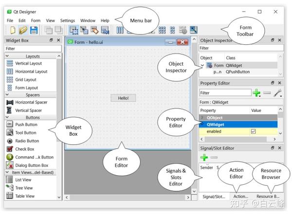 在开始学习如何设计自己的UI之前,先熟悉一下Qt Designer的界面。下面的截图显示了Qt Designer的不同部分。在设计我们的UI时,我们将逐步了解他们: