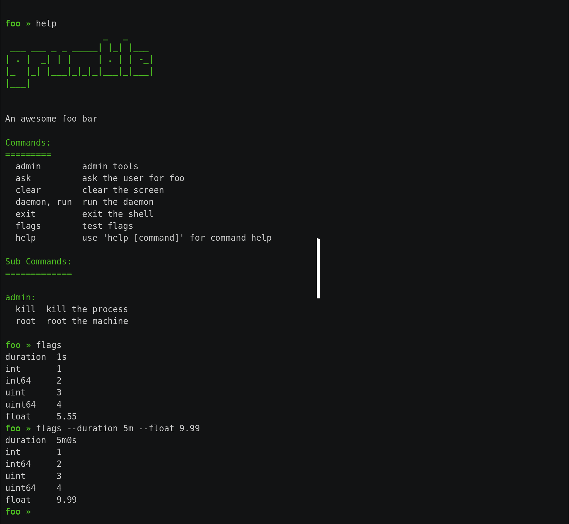 像 grumble 这样的库可之称为 framework,是因为它不需东拼西凑就可以满足绝大多数的需求。但上面也是因此感慨,这样的 framework 市场却不大,或许是因为 interactive CLI 本身需求,大多是语法特别特别复杂的,否则直接 spf13/cobra , urfave/cli 就完事了。