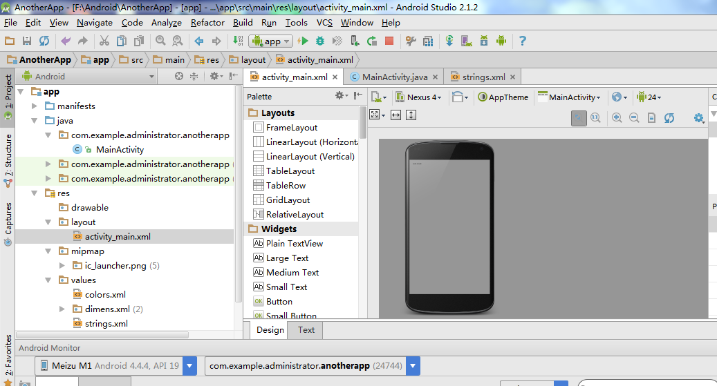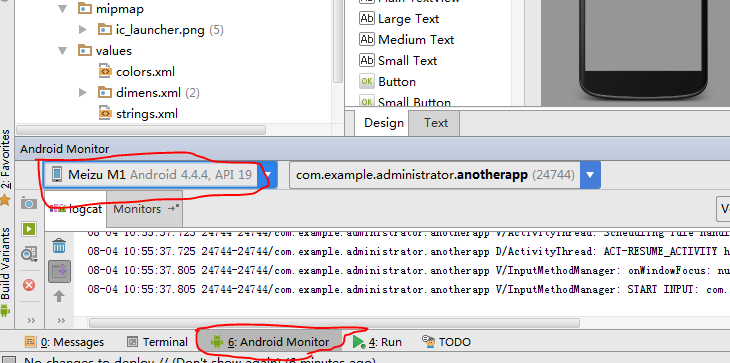 启动run后,软件开始生成apk安装包,并自动安装到手机上,第一次执行的话会慢一些,往后就快了。然后我们识别出来的设备可以再Android Monitor这一栏中看到