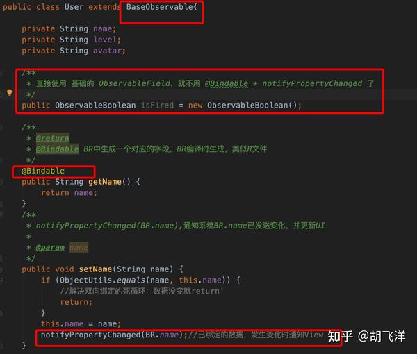 原本我们使用DataBinding,在xml中定义的variable数据 ,必须要继承BaseObservable 或者使用 ObservableField,还要添加 注解 @Bindable、调用notifyPropertyChanged(BR.name)。这是为了 user.setName(name) 字段发生变化时 通知 对应绑定View 也进行刷新。