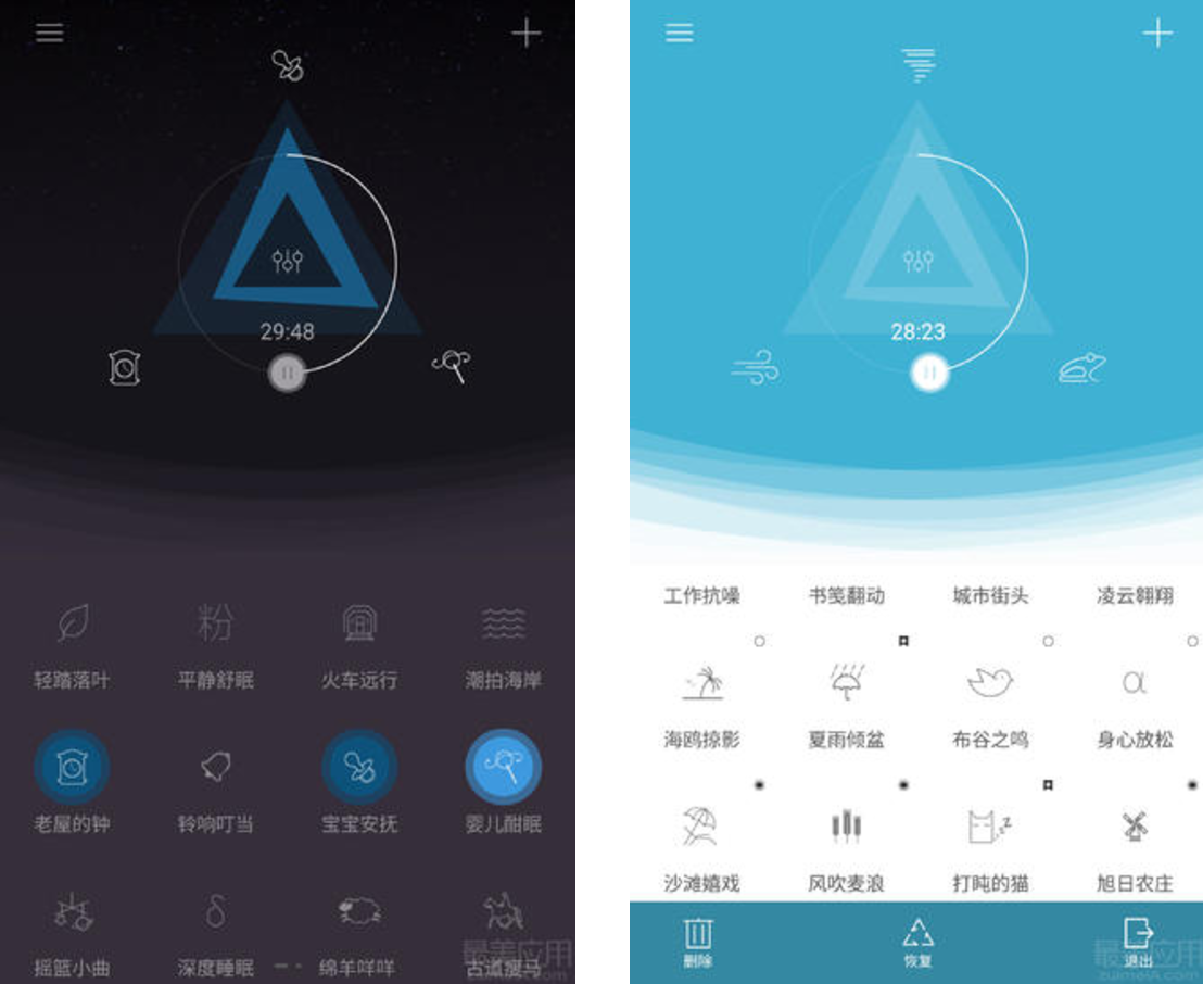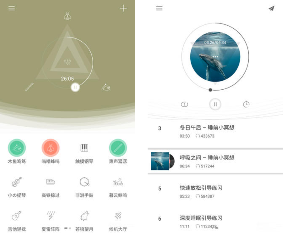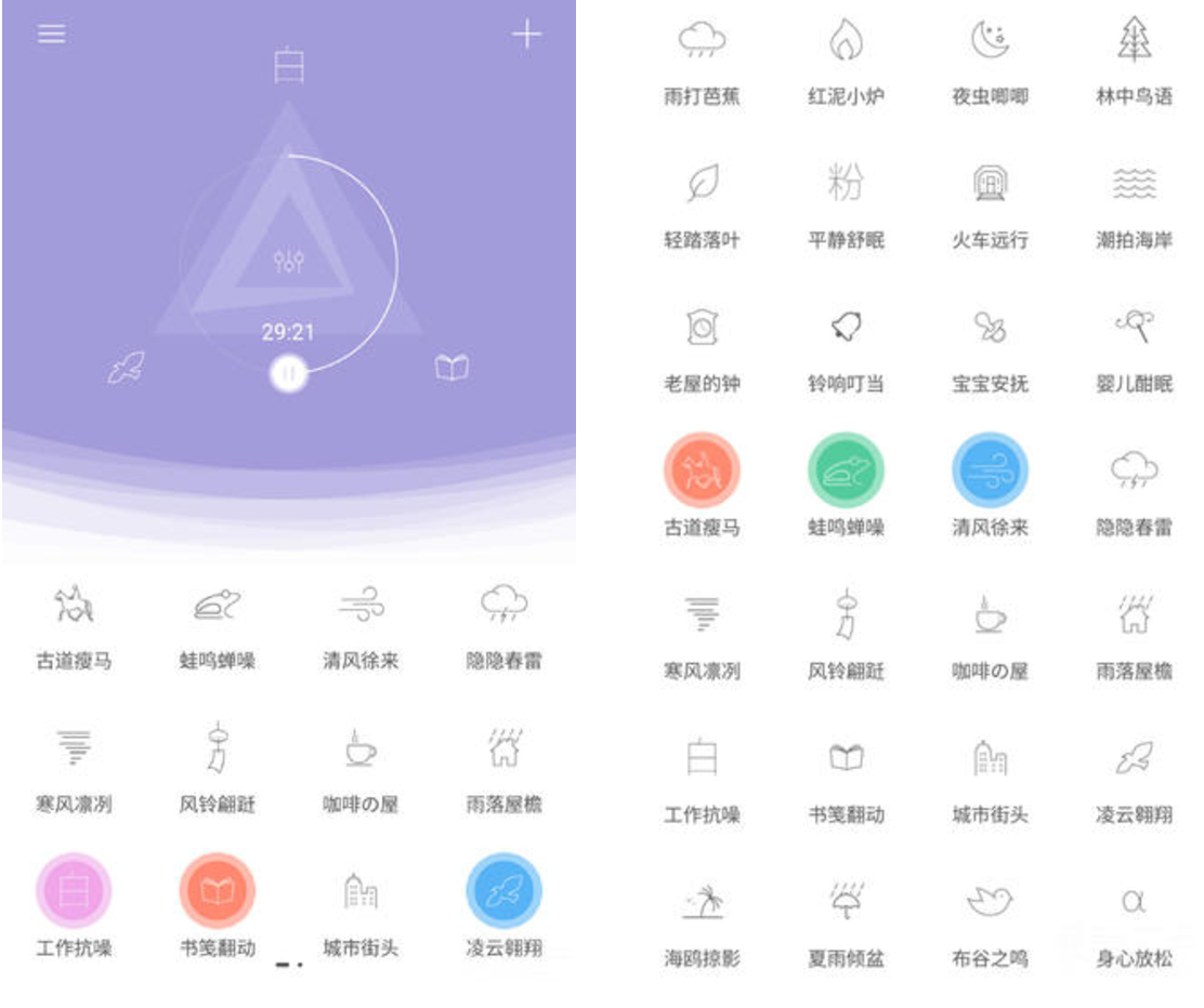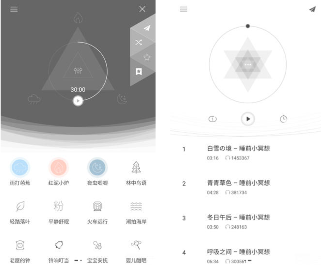 打开【小睡眠】App,映入眼前是一个超级简约的主界面,顶部是播放控制区,下方是声音列表,左上角是汉堡菜单,右上角功能加强区。主界面左滑进入一个新的人声引导语页面,整体布局与主界面类似。这样超简约设计,降低用户学习成本,上手难度为零。
