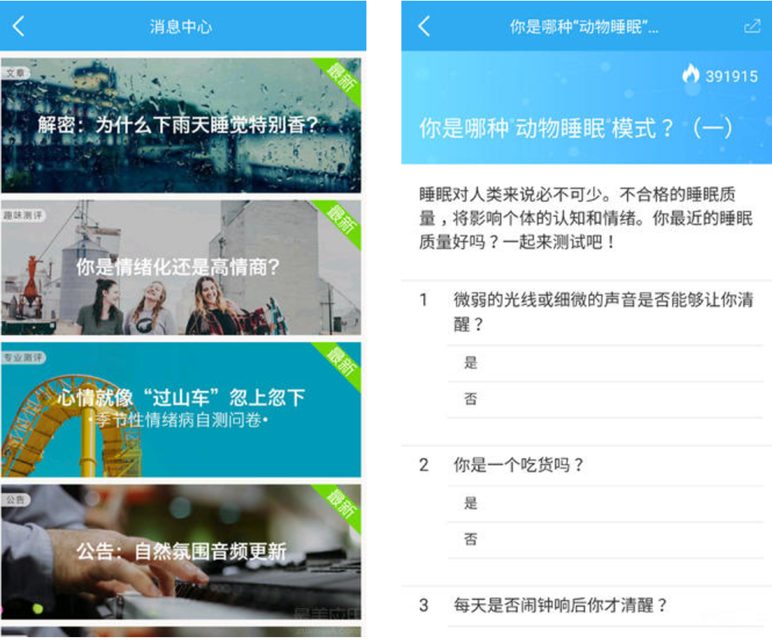 除了声音助眠,在发现中心栏目,【小睡眠】提供专业文章,你可以在里面学习睡眠情绪养护知识,也可以轻松愉快做做趣味或专业测试,了解自身状态。