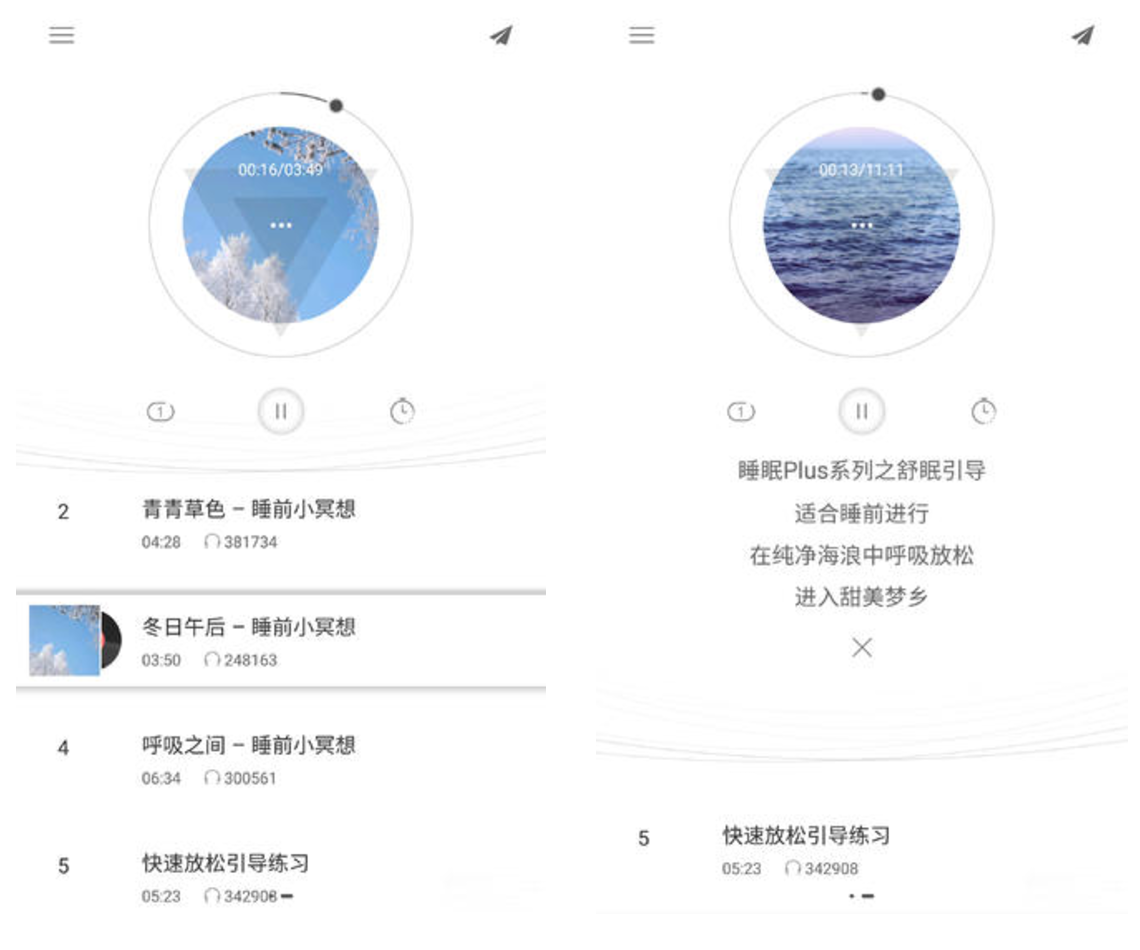 不仅如此,【小睡眠】App更是引入专业催眠师、心理师和主播录制多个助眠音频,这些音频制作精良,有的引导进入一种冥想意境,有的教会呼吸调节放松方法。闭上眼睛,跟随主播温柔的口吻,不知不觉放松身心,进入温柔梦乡。