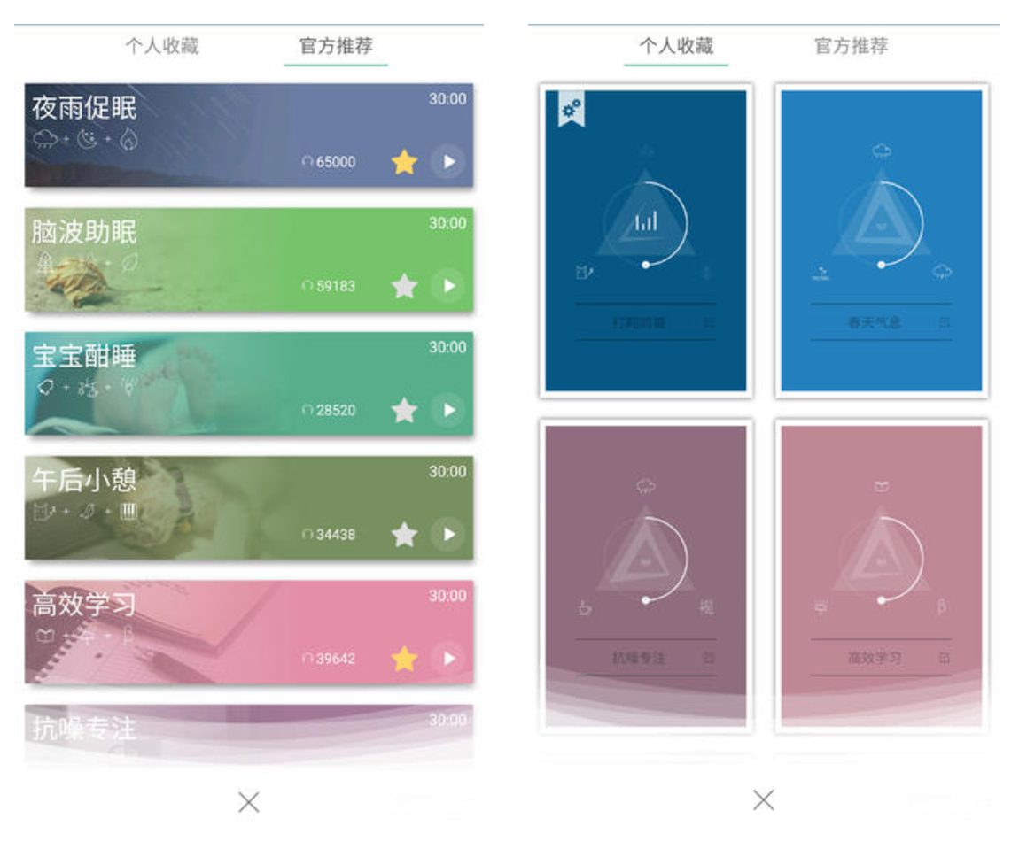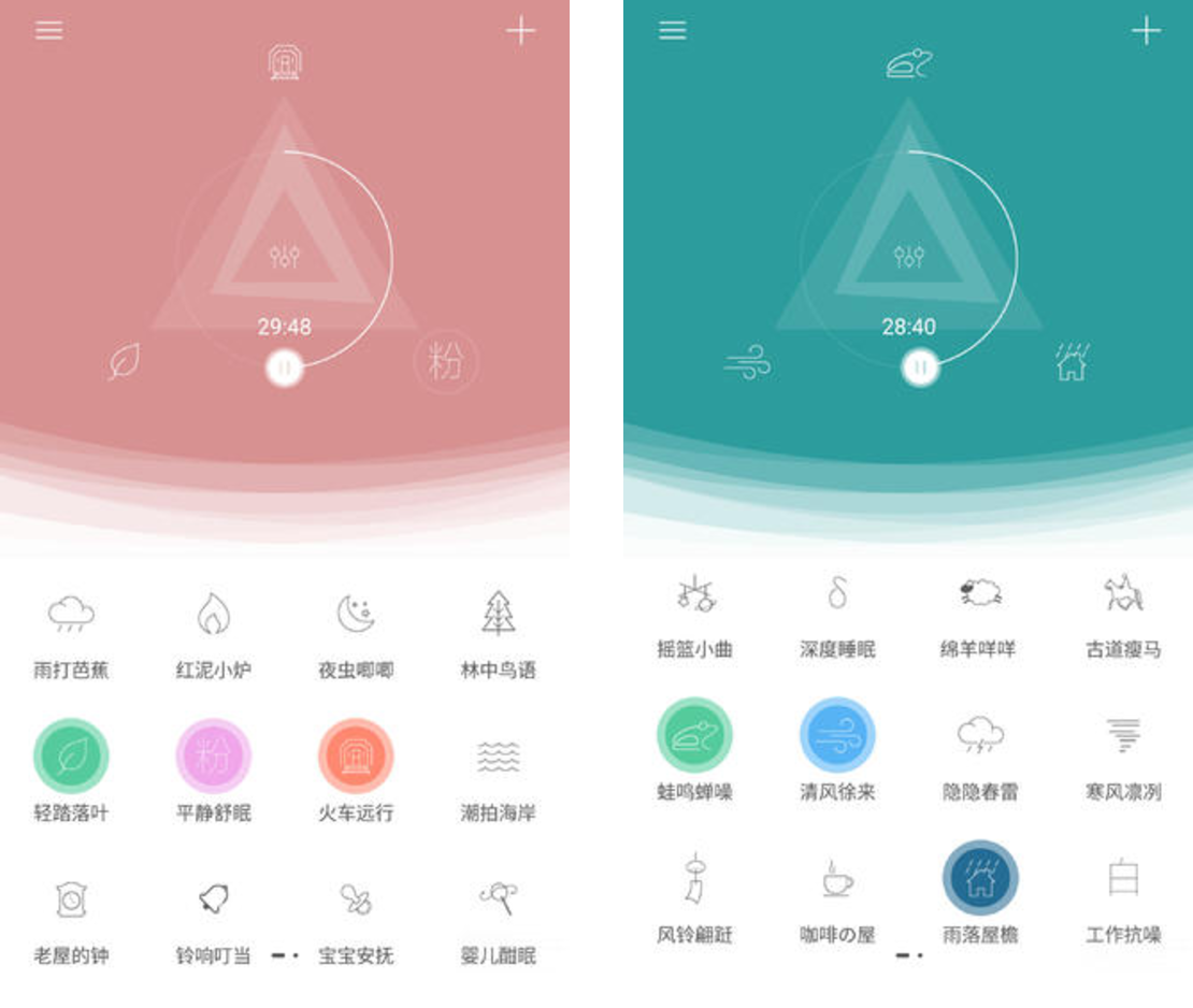 如果说这种简约设计让人为之心动,那么,真正让人彻底爱上的是声音播放开启的一刹那,整个界面画风突然一变,淡蓝、草绿、深紫、绯红、小粉等扑面而来。【小睡眠】里每一个音频都有对应的色彩,出众的产品设计幻化出五彩斑斓的颜色。这时,如果盯着这些颜色看,你会隐约感觉到有点不一样,颜色不仅治愈,甚至多看几眼会产生眼神迷离感觉。当然,这些养眼颜色可是不是你想象那么简单,融入色彩催眠暗示原理,难怪看起来那么特别,【小睡眠】App果然是专为助眠而开发。