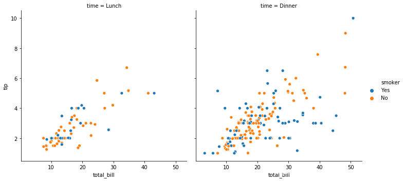 sns.relplot(x="total_bill", y="tip", color="c",col="time", hue="smoker",data=tips)