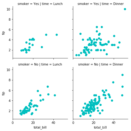 g = g.map(plt.scatter, "total_bill", "tip", color="c")