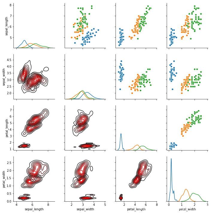 g = g.map_lower(sns.kdeplot,color='r')#在下对角线子图上用二元函数绘制的图