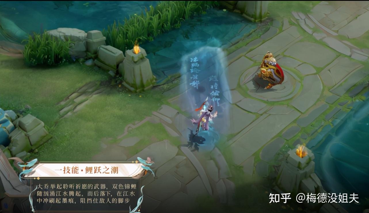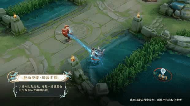 最后是这款皮肤的亮点,大招。在使用后,大乔会召唤出一片水域,其中有着口含莲花的石头鱼石刻形象,在水域中心还赫然写着白鹤梁三个大字,同时周围也浮现出了不少诗句,有些若隐若现,有些则好像要上天。与二技能一样,在开启大招后也会有阳光普照的特效。仪式感很强。