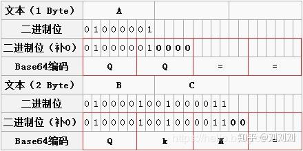 - 两个字节:两个字节共16个二进制位,依旧按照规则进行分组。此时总共16个二进制位,每6个一组,则第三组缺少2位,用0补齐,得到三个Base64编码,第四组完全没有数据则用“=”补上。因此,上图中“BC”转换之后为“QKM=”;