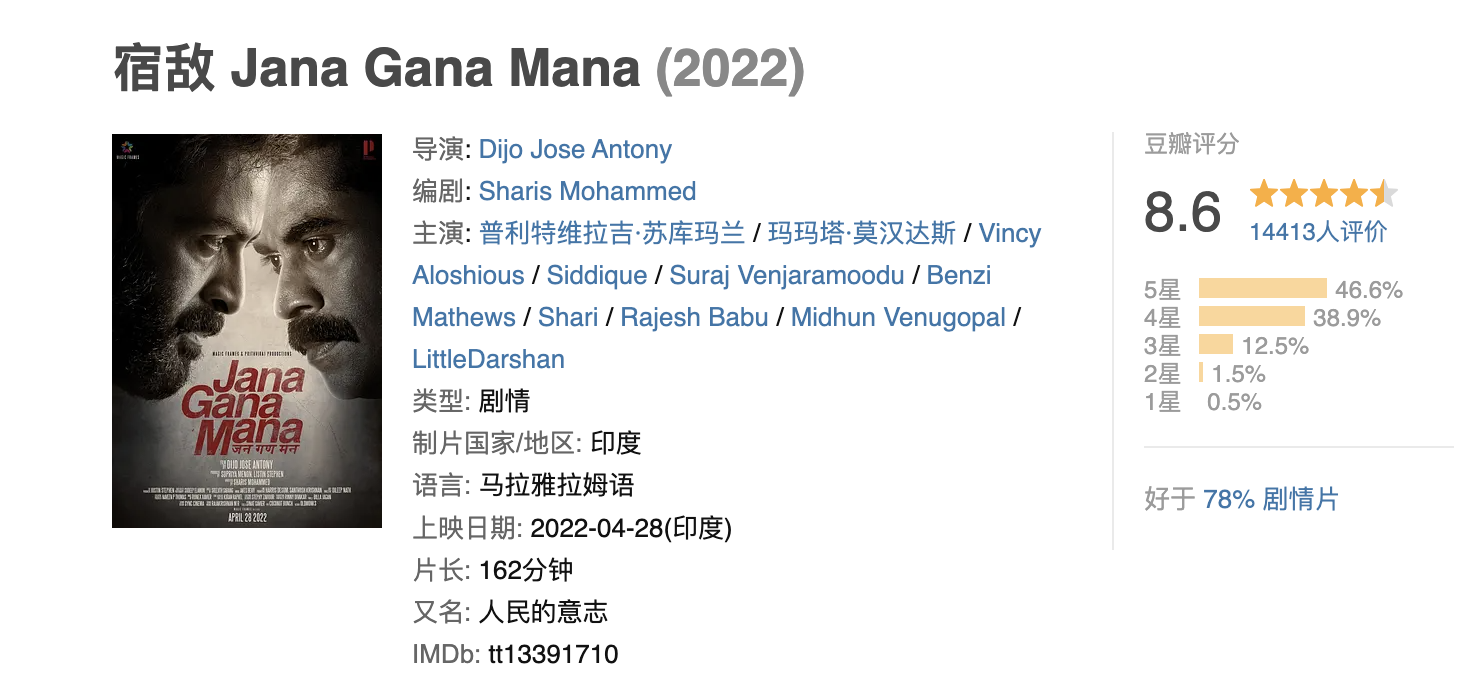 《宿敌》的缺点,我个人认为有两个地方,一是它的配乐,和很多印度电影一样,起到了对剧情的补充作用,但这部电影的配乐,虽然很好听,但有些煽情, 和整部电影冷峻的气质略微不搭 ;另一个,是结尾有点草草,可能是剧情反转的需要以及对下一部的铺垫吧,显得慌张凌乱了一些, 拉低了整部电影稳重叙事的高级感 。