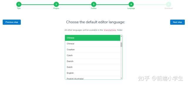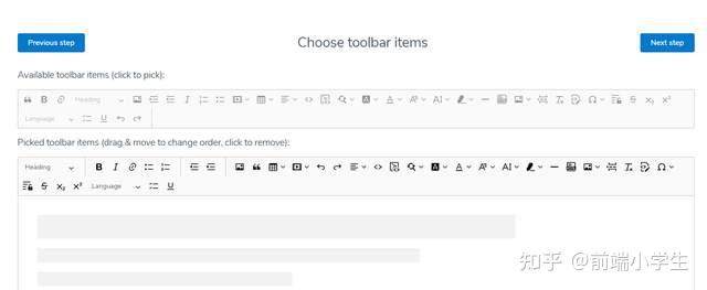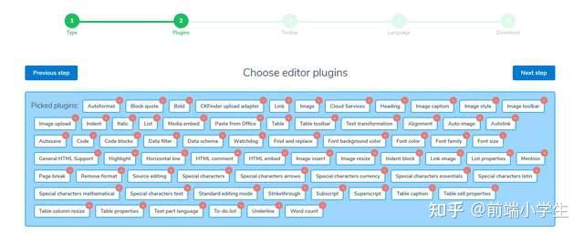 第二步 选择Classic 根据自身需求选择需要的ckeditor5插件 注意带有**标识的为收费插件,选择好后点击Next step,进入下一步