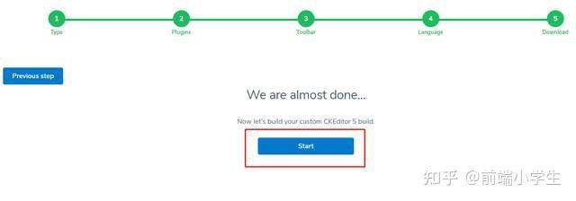 第五步 点击Start按钮 生成自定义构建压缩包, 然后点击 Download your custom CKEditor 5 build 按钮开始下载