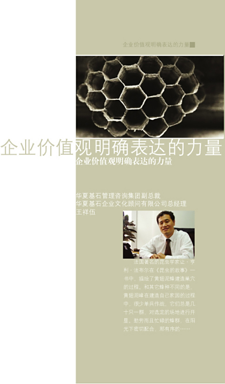 的那些公司来说,共同价值观决定了公司的基本特征,使其与众不同。更重要的是,这样,价值观不仅在高级管理者的心目中,而且在公司绝大多数人的心目中,成为一种实实在在的东西,它是整个企业文化系统,乃至整个企业经营运作、调节、控制与实施日常操作的文化内核,是企业生存的基础,也是企业追求成功的精神动力。