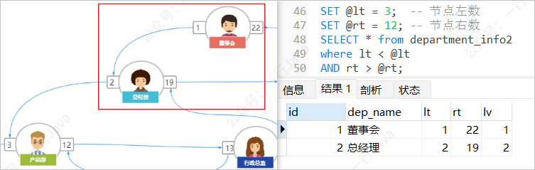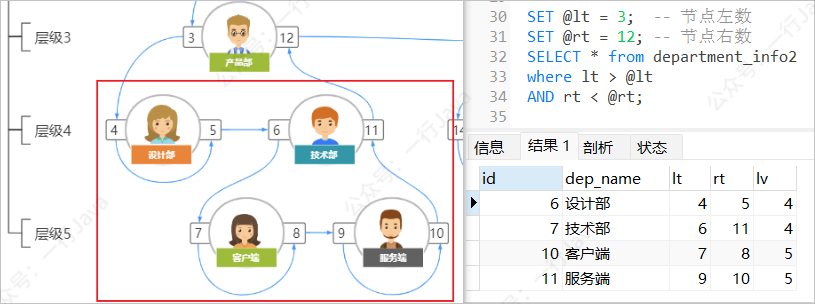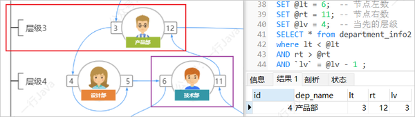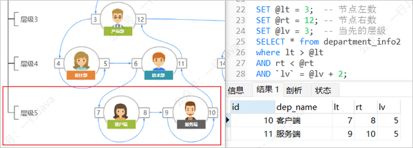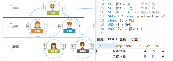 - 增加节点 比如要在技术部下添加一个测试部门INSERT INTO department_info(`id`, `dep_name`, `level`, `parent_id`) VALUES (12, '测试部', 5, 7);