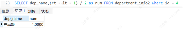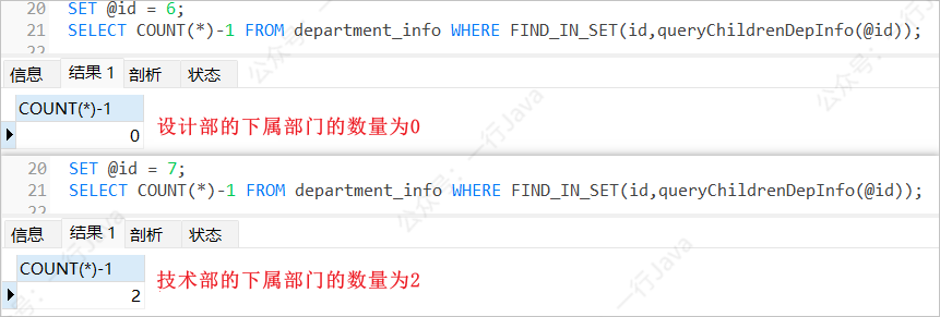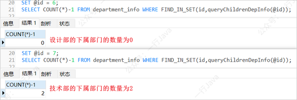 SELECT COUNT(*)-1 FROM department_info WHERE FIND_IN_SET(id,queryChildrenDepInfo(@id)); - 添加叶子节点的标记在表中添加一个isLeaf字段,当节点增删改操作的时候,用这个字段来标记一下当前是否是叶子节点