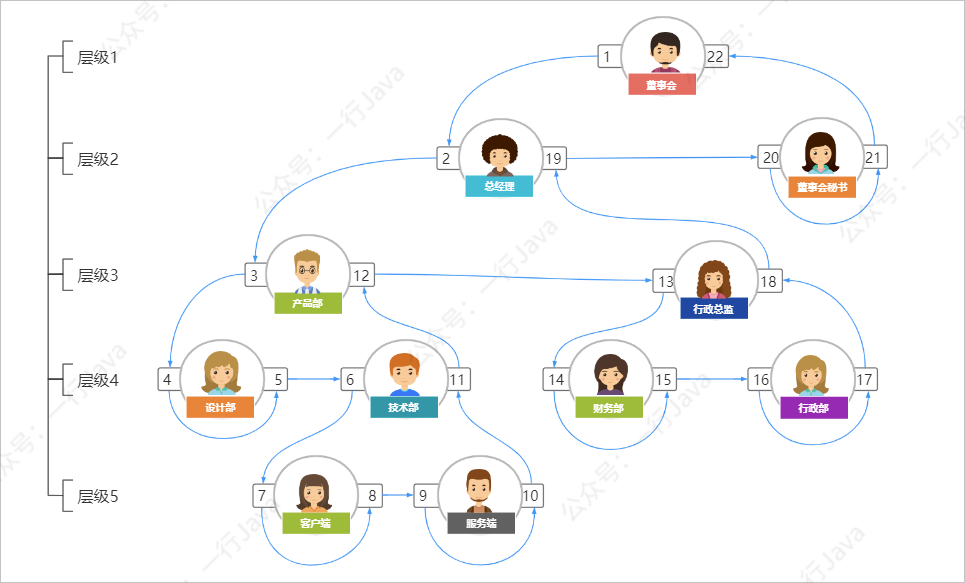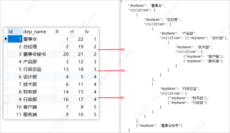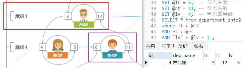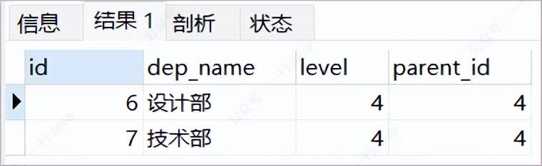 IDdep_name(部门名称)level(层级)parent_id(父ID)1董事会102总经理213董事会秘书214产品部325行政总监326设计部447技术部448财务部459行政部4510客户端5711服务端57