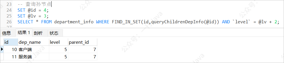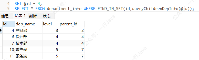 SELECT * FROM department_info WHERE FIND_IN_SET(id,queryChildrenDepInfo(4)); -
