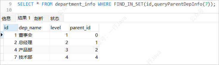;;DELIMITER ;测试:查询技术部所有的祖先节点?SELECT queryParentDepInfo(7);