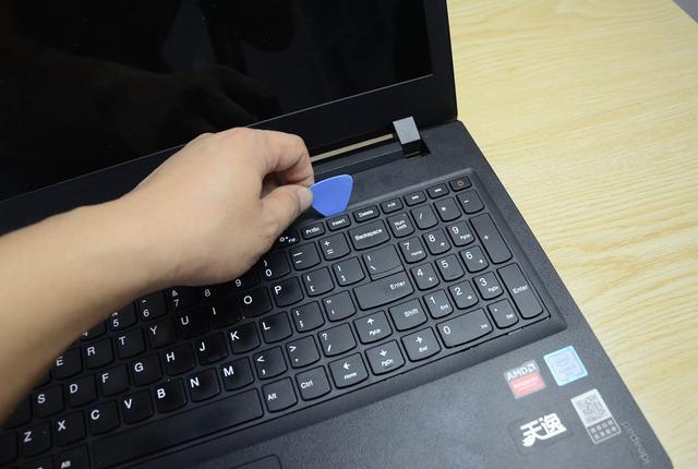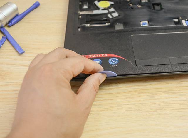 联想天逸310的拆机资料网上没有,我也咨询过联想客服,结果客服也没有官方的拆机资料,百度也找不到这个版本的拆机帖子,所以,我这个算是网上的首拆帖子。拆机时要用翘片先把键盘拆开,拆键盘时要注意,从我图示的位置拆最容易,键盘用了多个卡扣固定的。