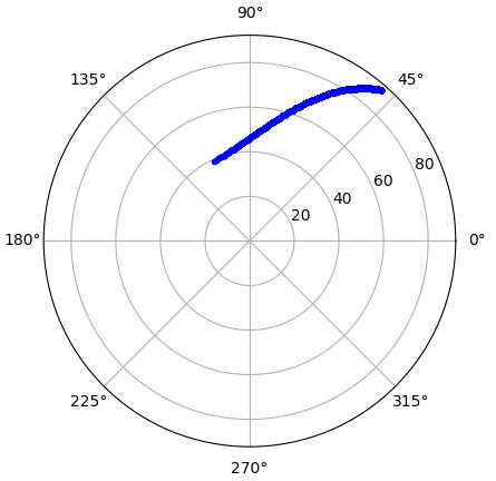 答:可以。绘制skyplot时不用调用basemap模块。首先计算出各历元各卫星高度角和方位角,然后当卫星可见时,使用极坐标即可绘制卫星分布图(雷达图)。下图给出在2019年1月1日测站abpo上空C13卫星的运行轨迹图。
