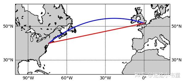 答:可以。比如需要连接地图上已知经纬度(lat1,lon1;lat2,lon2)的两个点,可使用plot来进行连线,basemap中暂没有画箭头的函数,可用plt.arrow绘制箭头。一些更高级的用法,比如画球面距离,可使用drawgreatcircle函数。下图实例为绘制伦敦到纽约的直线以及球面距离。