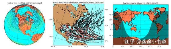 如下所示,basemap的功能有且不限于绘制地图、等高线、降水量图、海平面气压天气图、晨昏线等,具体功能及对应实例代码可参考 https:// matplotlib.org/basemap/ users/examples.html 。本文后续内容也给出了多个样例。